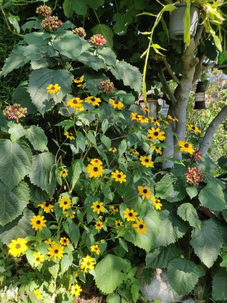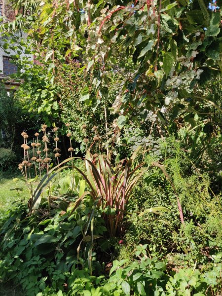 Le jardin est en quatre parties distinctes : une pelouse pour faire rouler le ballon de mes 3 garçons, des plates-bandes fleuries, un potager et une prairie pâturée par un cheval. Le tout s'étend sur 56 ares. Pas de compost mais des déchets verts et bruns sont jetés sur le potager. Une remise abrite un nid d'hirondelle rustique (deux couvées en 2019) et un nid de troglodyte mignon dans des cordes de ballots entrelacées! (cfr photo)